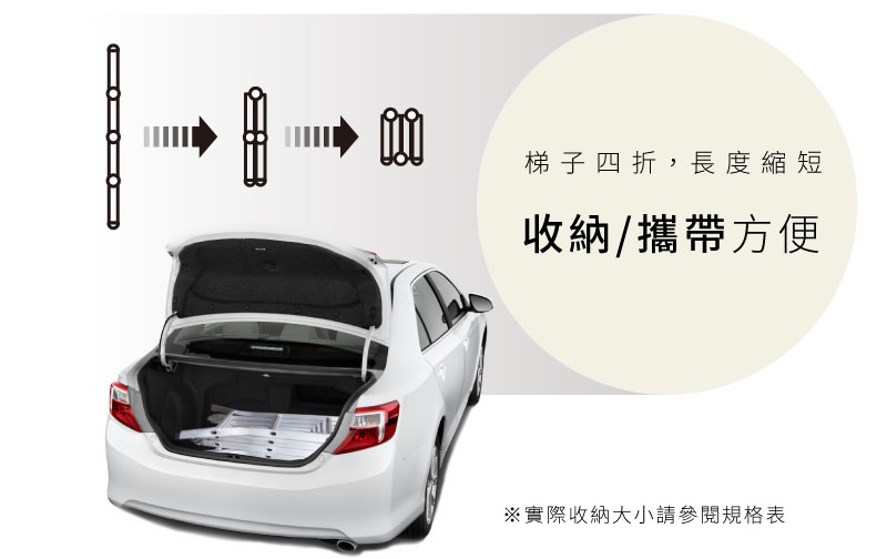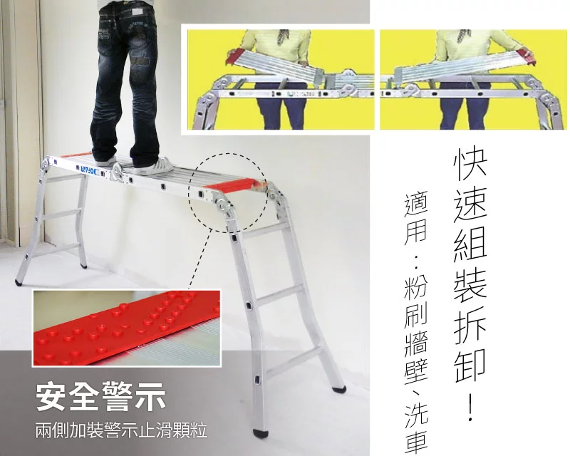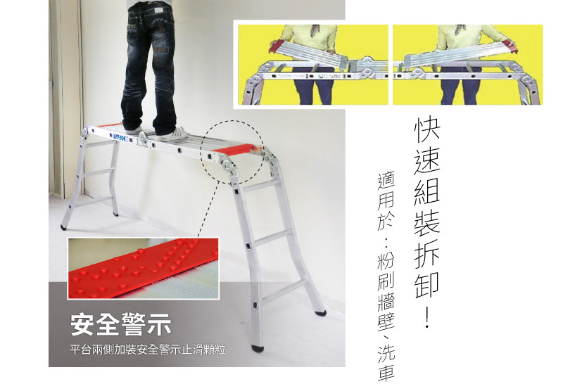 - 有別於一般市面四折梯,可加購專利快拆平台,拆裝簡單又快速