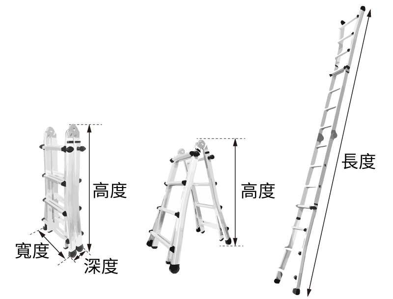 • 多功能應用:適應各種使用情境,如A梯、直梯、靠牆90度、樓梯間高低差。
