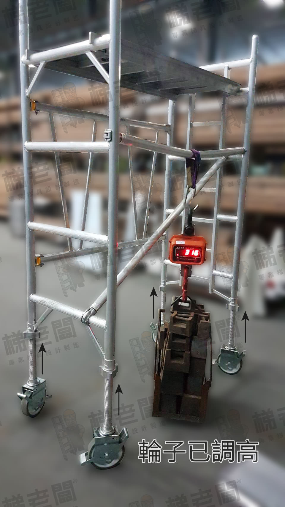 何謂『荷重』?以小型施工架測試為例,讓您不被數字蒙騙。 2019-06-21 /Posted by梯老闆 / 2594 常遇到很多朋友問說,為什麼你們梯具荷重只有150公斤,施工架只有200公斤/每平方米,別人的產品可以達到250公斤或者300… 咱們就趁這個機會說明一下吧~ 舉例來說梯老闆的施工架是遵照歐規規範 EN1004:2004 (歐洲市場的規範) 下方照片中梯老闆用了300公斤的重量來測試施工架的橫向拉桿;超過500kg的砝碼來測試平台, 但產品還是按標準標示荷重200kg,多不行、少也不行…不能亂寫標示的。 若對商家荷重有疑問,亦可要求提供證明荷重文件 分享 Twitter Facebook 相關文章 知識分享 閱讀更多 如何挑選安全的工作用階梯呢? 2022-08-01 ... 繼續閱讀 相關法規參考 閱讀更多 梯老闆的梯子用的關節是否屬於合梯的繫材? 2022-03-14 ... 繼續閱讀 相關法規參考 閱讀更多 工作場所如何挑選合格的合梯? 2021-05-20 ... 繼續閱讀 最新消息 閱讀更多 高低差環境高空作業-樓梯間梯具、鷹架使用示意 2020-09-24 ... 繼續閱讀 捲揚式防墜器及背負式安全帶之使用概述 2020-04-20 ... 繼續閱讀